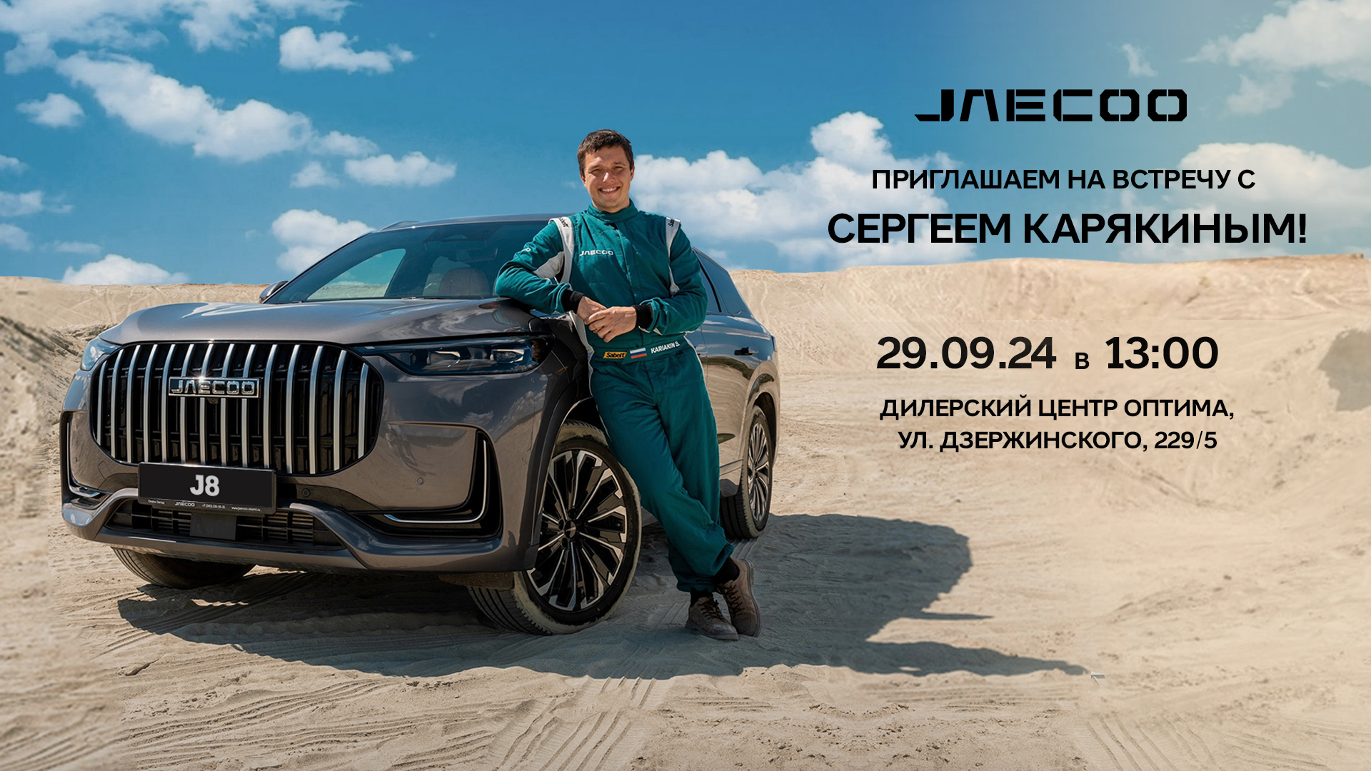 Вас ждет приятная атмосфера, фуршет, розыгрыш подарков, тест-драйв автомобилей и главный гость мероприятия – Сергей Карякин, готовый ответить на все важные вопросы о JAECOO.